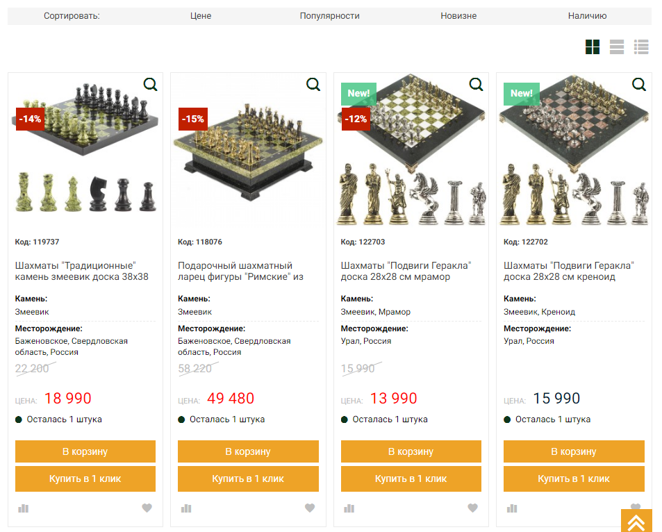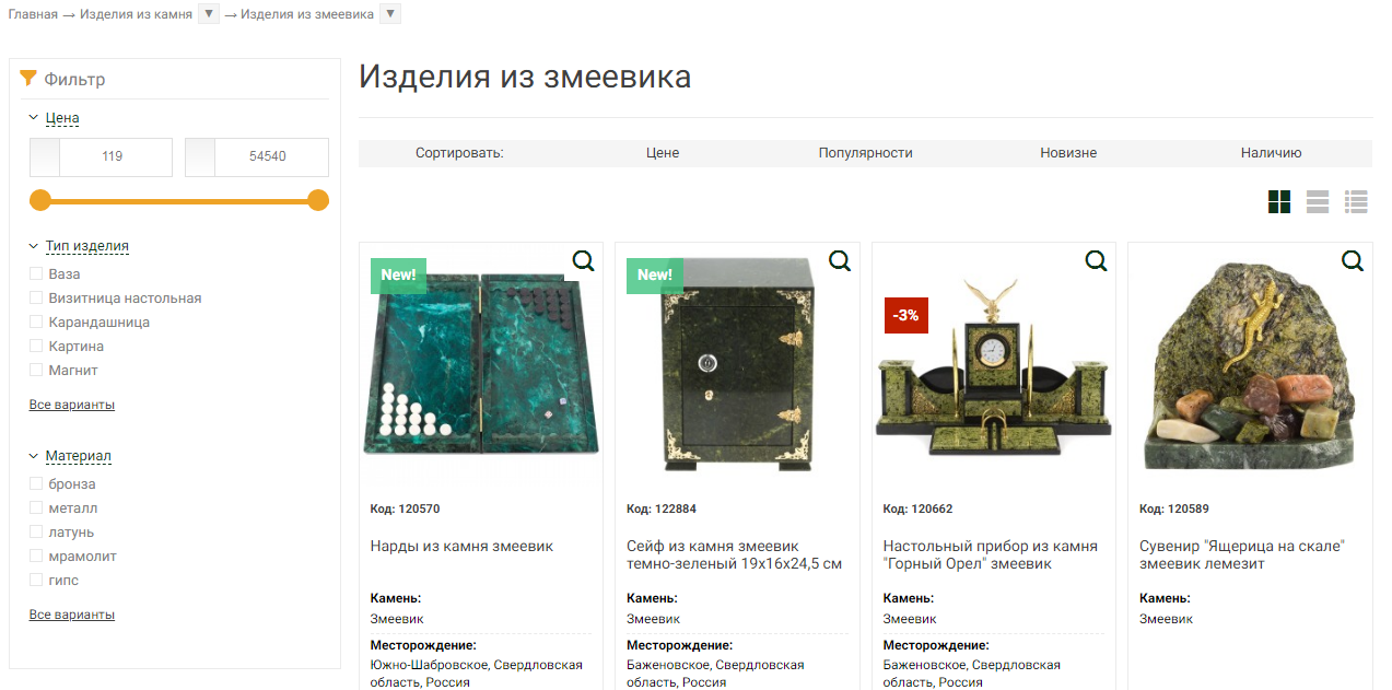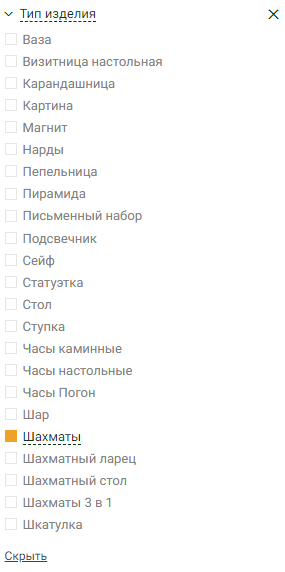В том случае, если Вы точно знаете, какой именно товар Вам нужен, можно воспользоваться фильтрами, чтобы из всего ассортимента выделить именно то, что Вам подходит. Давайте разберем, как работают фильтры на конкретном примере. Предположим, Вам нужны шахматы из змеевика.