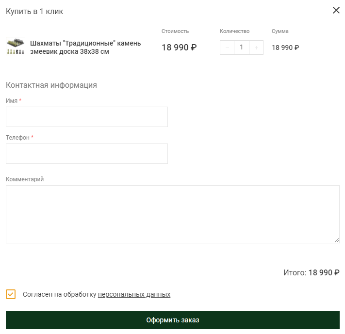 Стандартный способ оформления заказа позволяет Вам более наглядно выбрать способ получения заказа, оставить комментарии к заказу, а также указать дополнительные каналы связи с Вами.