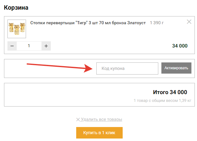 Если у Вас есть купон на скидку или промокод, его необходимо ввести на данном этапе. Для этого нужно в поле «Код купона» ввести номер купона/промокода и нажать кнопку "Активировать":